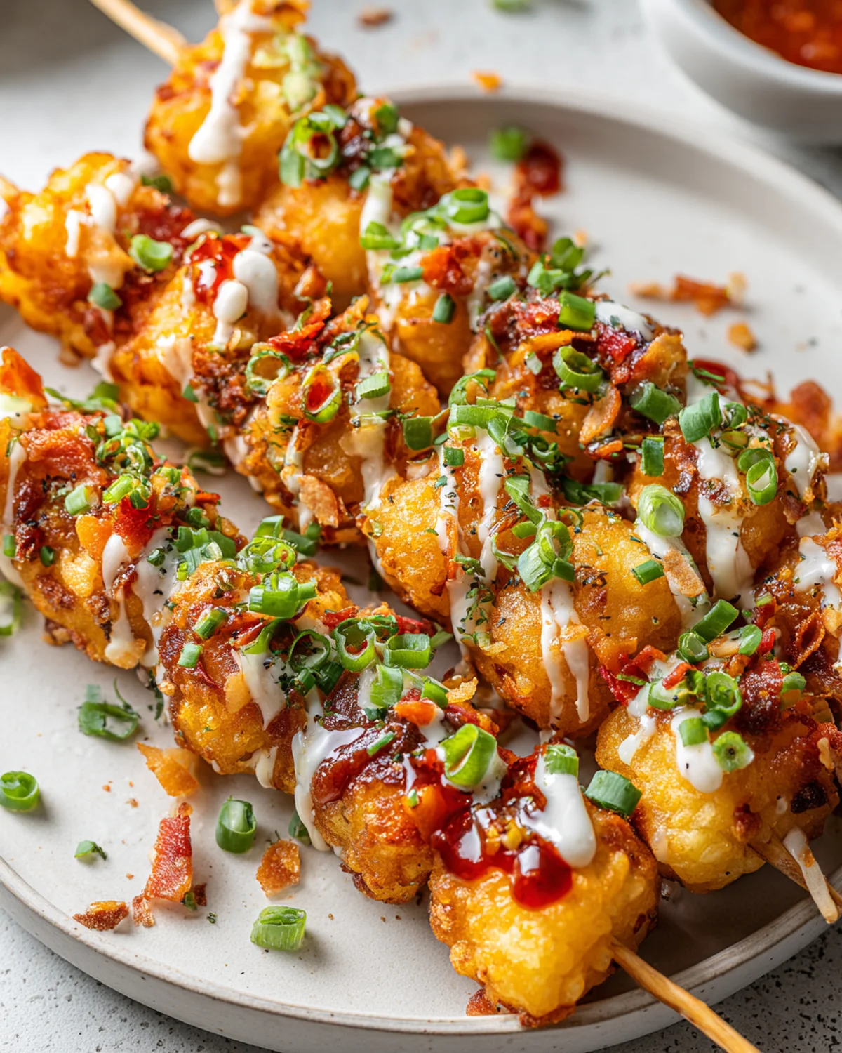 Imagine the delight of biting into a crispy tater tot, perfectly golden and topped with gooey cheese, smoky bacon, and a sprinkle of fresh green onions. This dish is a hug on a skewer, promising to bring smiles and satisfaction to both young and old. It’s a recipe that celebrates simplicity, requiring just a few ingredients that you might already have in your pantry. And perhaps most importantly, it’s a dish that invites you to gather around with your loved ones, creating new memories while savoring each bite.