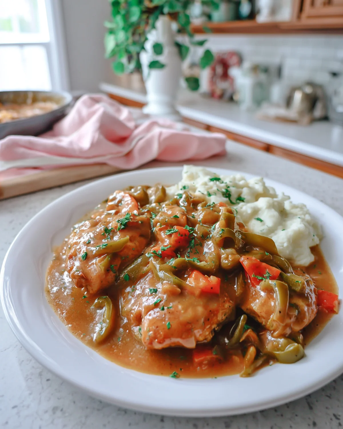 - Smother the chicken. Return the seared chicken thighs to the skillet, nestling them into the gravy with the peppers and onions. Spoon some gravy over the top and cover the pan. Simmer on low heat for 15–20 minutes, allowing the flavors to meld and the chicken to become fall-apart tender. This gentle cooking process ensures the chicken remains juicy and absorbs the savory flavors.