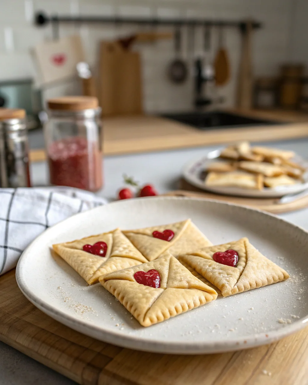 - Spoon a teaspoon or two of strawberry jam into the middle of the diamond shapes. Fold three of the corners into the center (sides and bottom) so that the pastry looks like an open envelope. Press the corners in to seal the jam in. This step is where the magic happens, transforming simple dough into a love letter.